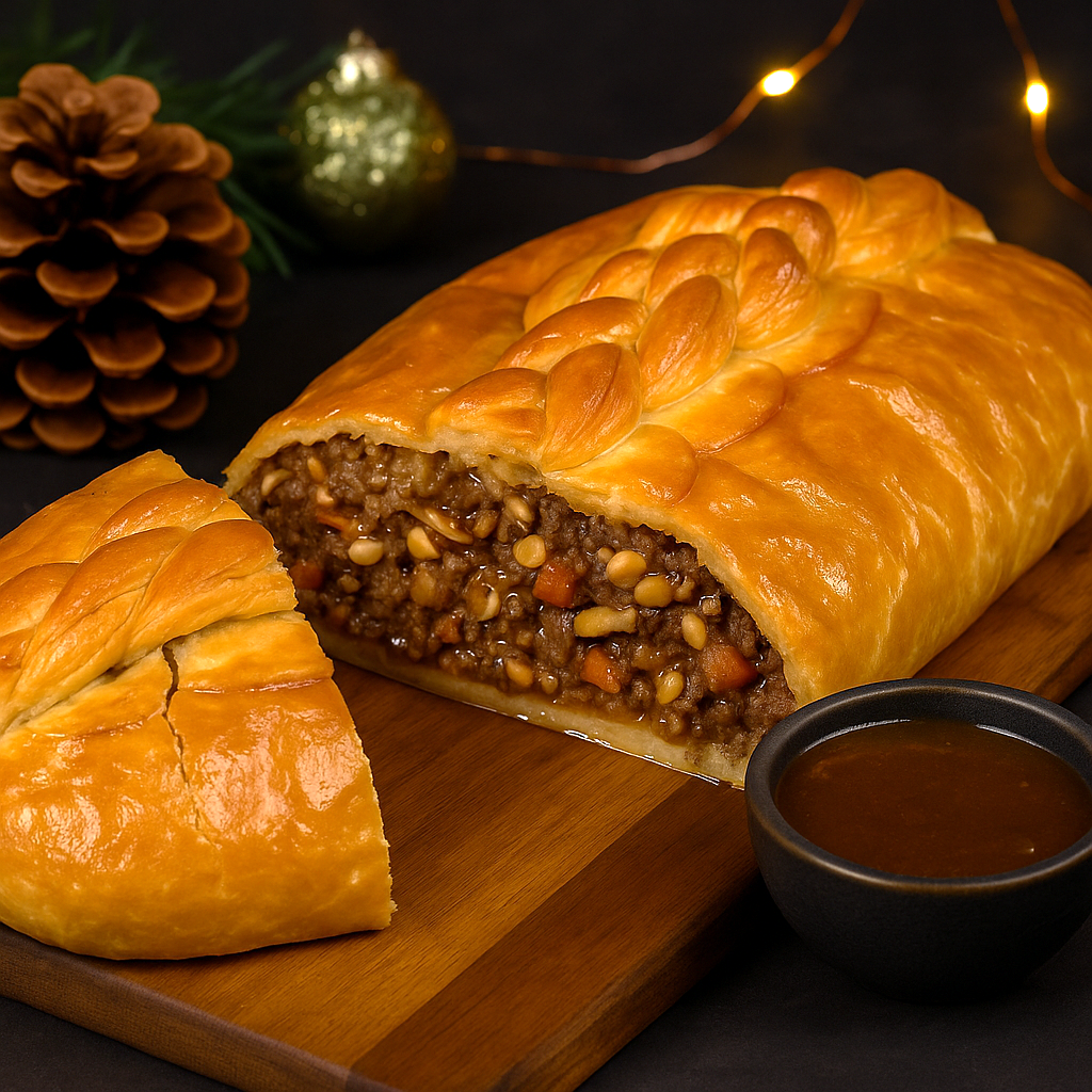 Pastel realizado con hojaldre de la mejor calidad, relleno de manera artesanal con carne magra 100% ternera, setas silvestres, queso y almendras.
